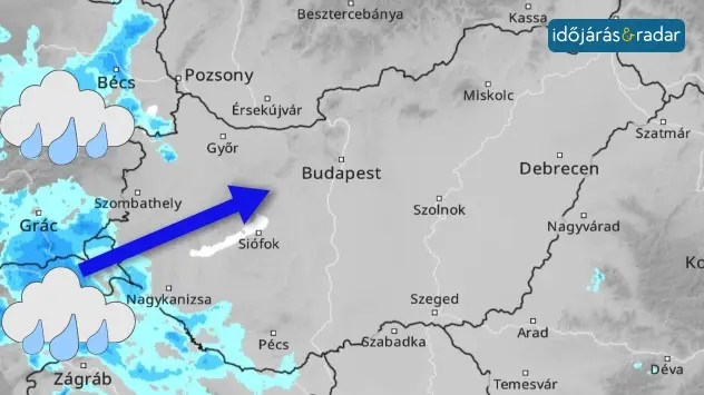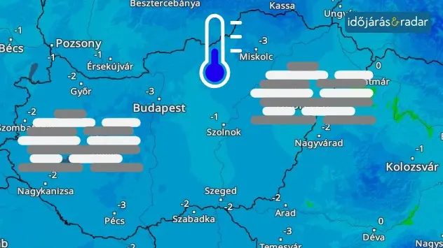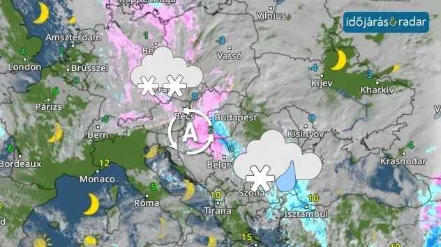 Európa időjárási térképe, kék hideg levegő nyíllal Kelet-Európa irányába. Erősen csökkenő hőmérséklet, mínusz értékekkel Vilniusban és Kijevben.