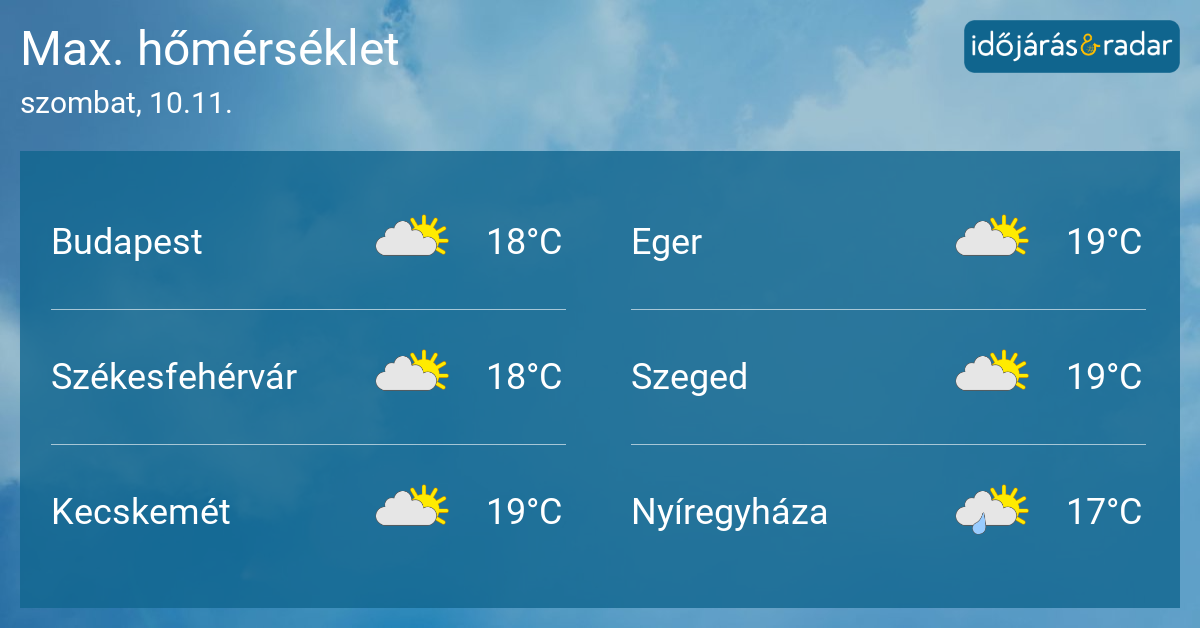 Ahogyan a fenti térképen is láthatjuk, nyugat felől egy erősödő anticiklon terjeszkedik fölénk. Frontok messze elkerülik hazánkat. A maximumok a legtöbb helyen 15 és 19 fok között alakulnak.