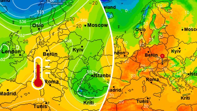 Kettős kép: alacsony vízállás egy folyón és Európa térképe a hőmérsékleti eltéréseket pirossal jelölve. Március sok helyen túl meleg és túl száraz volt. A legnagyobb eltérések Kelet-Európában voltak.