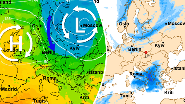 A bal oldalon látható időjárási térkép egy hidegfronttal járó alacsony nyomású területet mutat Írországtól Skandináviáig. A jobb oldalon 100 km/h-ás erős széllökések jelölve a Északi-tenger és Norvégia környékén.
