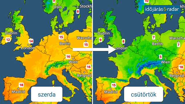 A hét közepére jelentős időjárás-változás várható. A Brit-szigetek felől induló sarkvidéki hideg levegő áramlik Franciaországon és a Benelux-államokon át Magyarországra.