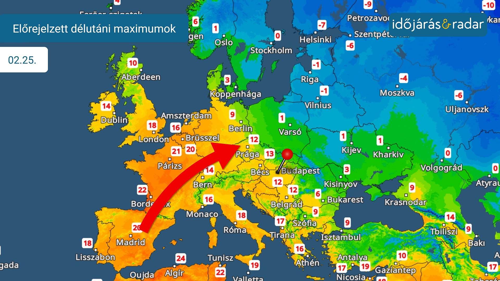 Innen egy kiterjedt meleg levegőáramlás indul el, és fokozatosan elárasztja a kontinens nagy részét. Így a hét közepétől a hőmérséklet Közép-Európában is 15-20 fokig emelkedik, Skandináviában pedig a fagy és a hó egészen Lappföldig húzódik vissza.