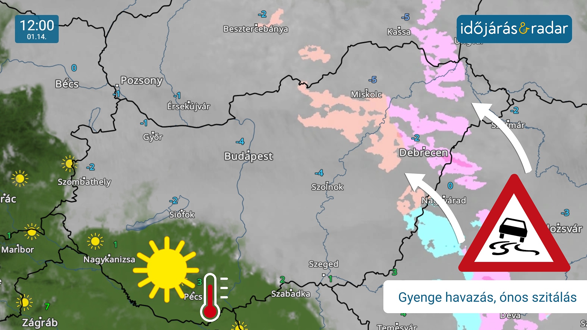 A szél napközben a Dunántúl déli részén élénkülhet meg, minden máshol mérsékelt marad a légmozgás. A napos részeken lesz enyhébb az idő, Pécs és Szekszárd környékén akár 8 fokot is mérhetnek. Az ország többi részén általában -4 és +2 fok között ígérkeznek a csúcsértékek.