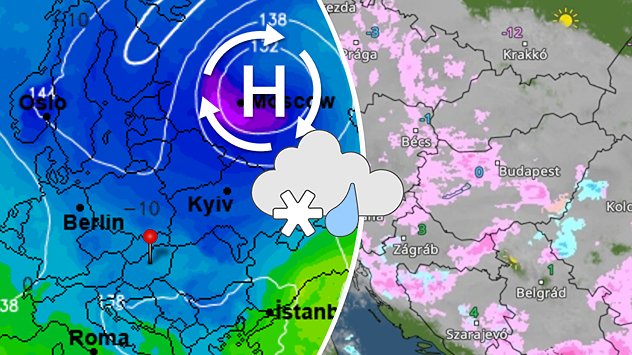 A bal oldalon az időjárási térkép hideget mutat az Egyesült Államokban. A jobb oldalon erős csapadék látható.