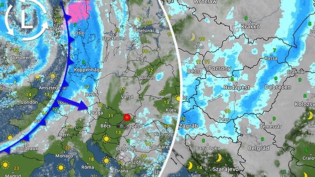 Ma este zápor vonul majd át. éjszaka eső is lehetséges. Viharos széllökés is kialakulhat. A hőmérséklet a következő órákban 8 fok körül alakul.